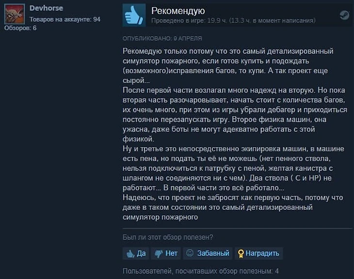 Немецкая студия Crenetic сделала сиквел к довольно успешному симулятору пожарного. Получилось не очень, техническая сторона оттолкнула немало игроков – всего 45% положительных отзывов.