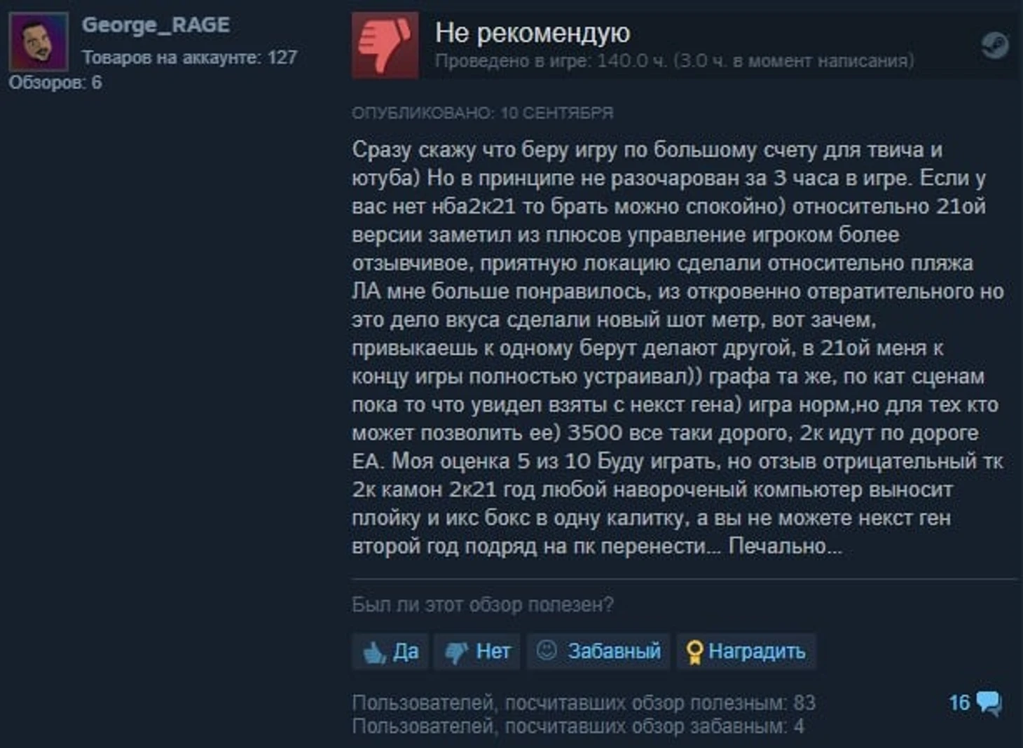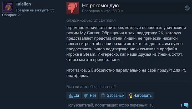 Симулятор баскетбола выступил столь же провально: 48% на основе 6700 отзывов. Visual Concepts кичится режимами: в MyTEAM собираешь команду мечты, в MyCAREER развиваешься с низов, а MyGM и MyLEAGUE создана для управленцев. А защищать добросовестных игроков от читеров никто не торопится – например, в онлайн-карьере читер получает победу сразу же при загрузке матча. ПК-версия опять крайняя, фанатам баскетбола в очередной раз приехал порт со старых консолей.
