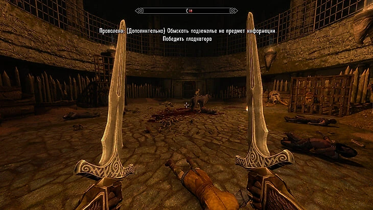 Сразу после того, как Драконорожденный пустит в чашу кровь, его срубит с ног. Он очнется в клетке со спальником, как в тюрьме, но путь из клетки ничем не закрыт. Весь инвентарь временно пропадет, так что ничего не останется, кроме как переодеться в броню, лежащую у выхода (или снять эльфийскую и кожаную с других трупов заключенных). Путь к свободе лежит через арену.