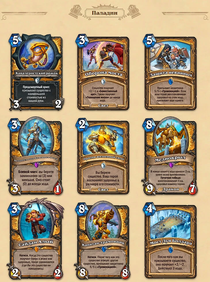 Вот кому не пожалели контрольных карт – так это Паладину. Не факт, что архетип заиграет, но как дополнительная помощь манускриптовому Паладину для выживания – отлично.