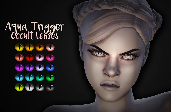 Мод состоит из сразу двадцати линз разных цветов, но одинакового узора. Зрачок вашего сима станет вертикальным и узким.