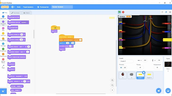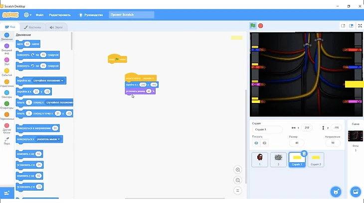 В момент нажатия флага спрайт будет скрываться, а после того как он получит сообщение «Задание», он будет перемещен на следующие координаты: х=-212, y=-116. В конце следует прописать уменьшение размера спрайта до 40%.