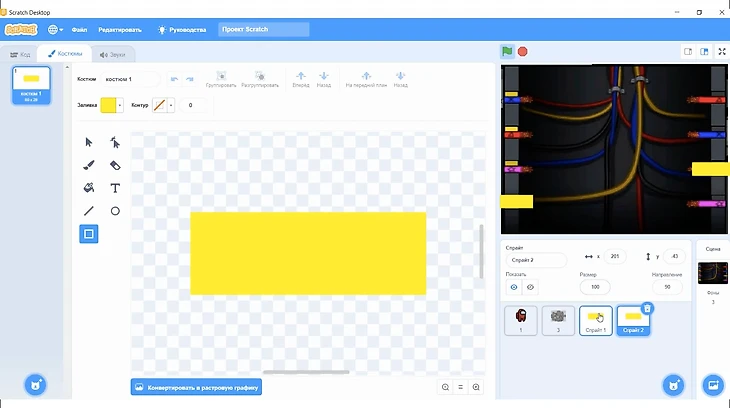 Нам нужно нарисовать сам фон задания, благо при программировании в среде Scratch это легко сделать. Для этого переходим в графический редактор и рисуем цветные прямоугольники, они станут началом и концом проводов. Поместим их на фон.