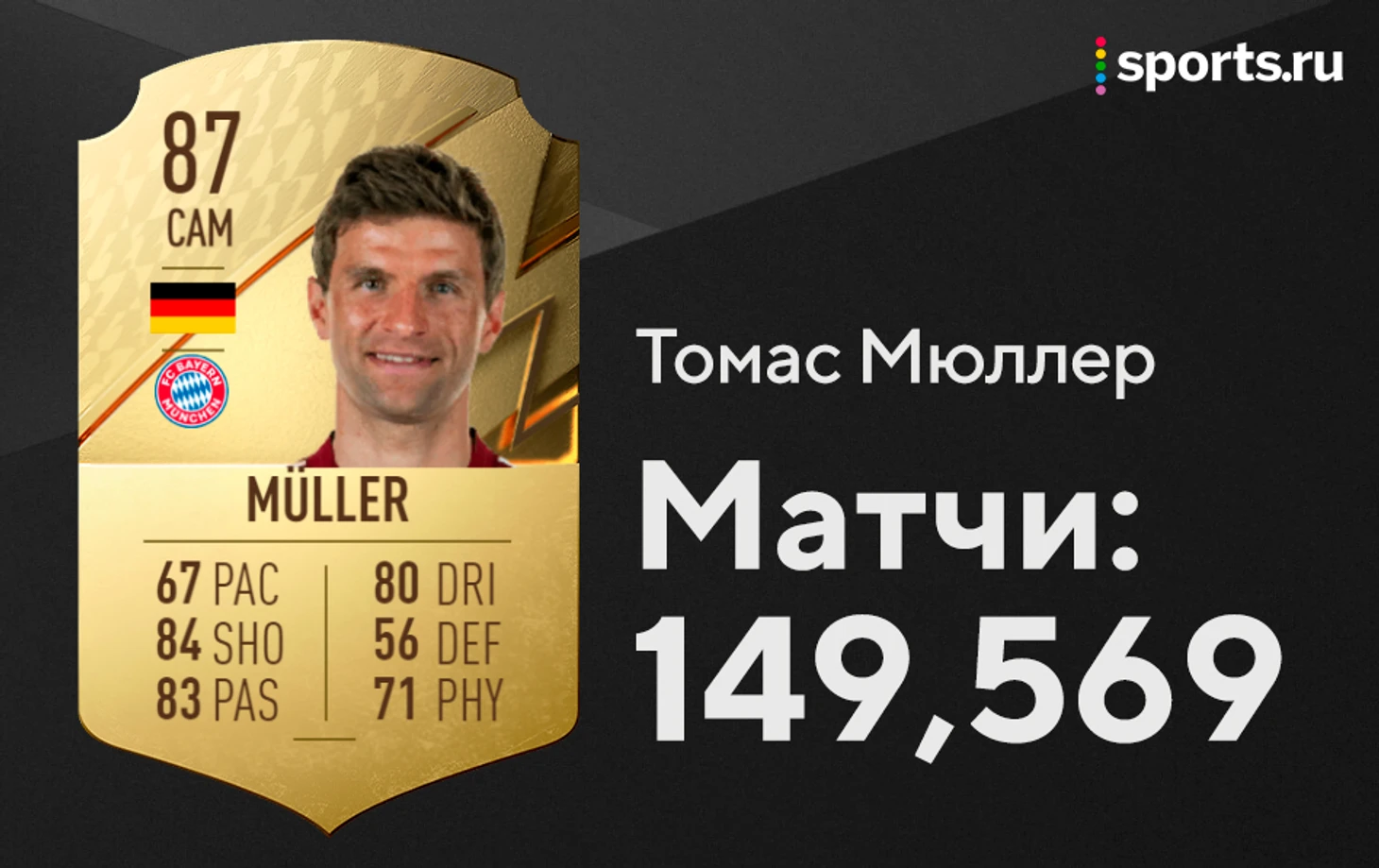 Томаса Мюллера называют игроком-загадкой не только в FIFA, но и в жизни. Чтобы отобразить его реальные умения, EA Sports искусственно завышает его рейтинг – на самом деле он ниже на 3 пункта. Карточка немца в FIFA не имеет никаких шансов закрепиться в метовых составах. Мюллер не только медленный, но и обладает ужасной игровой моделью.
