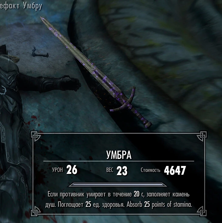 Меч Умбра – даэдрический артефакт, который появляется в Morrowind и Oblivion. По легенде, его создали из души одноименного героя по заказу Клавикуса Вайла, мечтавшего увеличить влияние на смертных. Но ведьма, создательница клинка, обманом заставила заключить в меч и часть души Вайла. Эта частичка души превратилась в отдельное существо – Умбру, жаждущую убивать.