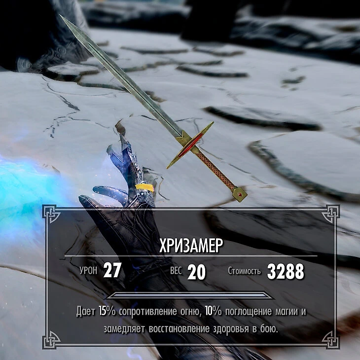 Клинок паладина Хризамер появился в серии с самого старта. Его можно было найти в Arena, Daggerfall и Morrowind. Позже он появился в Blades, а теперь, благодаря модам, и в Skyrim. Чтобы забрать клинок, нужно попасть в локацию Форелхост на юго-востоке от Рифтена.