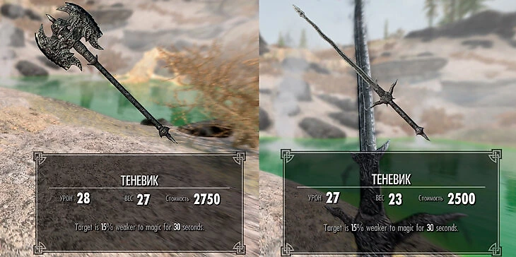 Меч или топор Теневик появляется в квесте главной сюжетной линии «Дрожащих островов». Чтобы его получить, нужно сразиться со своей темной копией, которая обладает той же экипировкой и навыками, что и ваш персонаж. В небольшом квесте Anniversary Edition тоже нужно сразиться со своим отражением, но перед этим не придется ползать по пещере. Взять Теневик можно неподалеку от камня Атронаха (если подняться к камню и взглянуть налево, будет виден лежащий в темной воде скелет – это нужное место).