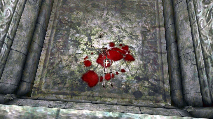 Слева от входа будет короткий путь к черепу Лаймарка, однако для преодоления препятствий потребуется высокий навык акробатики. Впрочем, можно обойти по правому пути, здание все равно небольшое. Тело Лаймарка лежит в луже крови внизу – похоже, у бедняги было плохо с акробатикой.