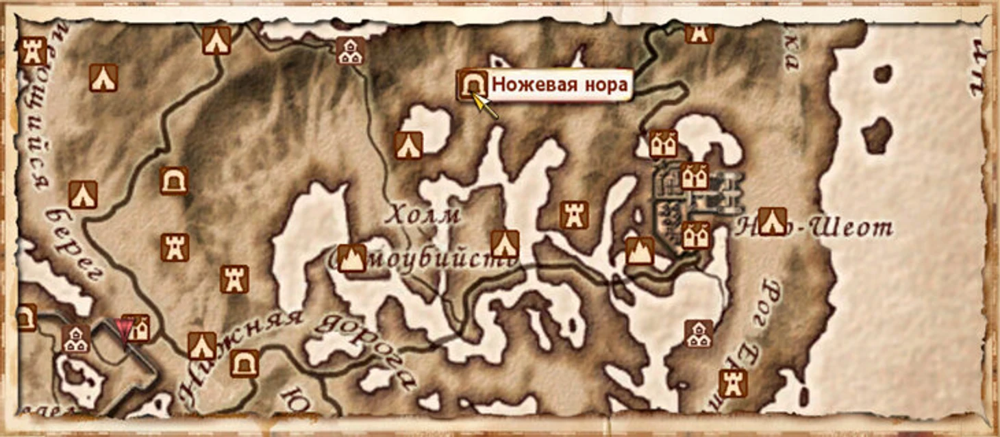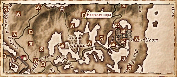 Ножевая нора находится на северо-западе от Нью-Шеота. Это та самая пещера, в которой находится библиотека Джиггалага, и Чемпиону Сиродила по квестам нужно поговорить с запертым там Диусом.