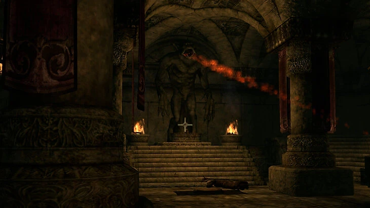 Перед походом стоит запастись зельями лечения, потому что в пещере находятся статуи, стреляющие огнем, а также зелоты. За черепом придется отправляться в следующую локацию – Пропасть, а потом в Святилище. Когда доберетесь до большой статуи, нужно пройти за нее. Дальше в полу будут дыры – падайте, пока не попадете в самый низ.