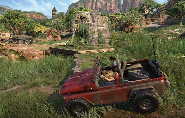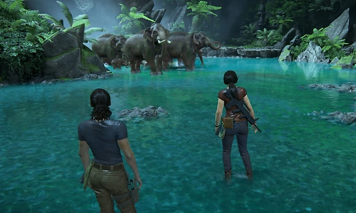 Павлин-орехокол – победив врага, будьте осторожны. Под вами провалится железная дорога. Вернитесь к Сэму и Надин. Прежде чем забросить к ним веревку, нужно спуститься по камням и оказаться на уступе, где спрятано сокровище.