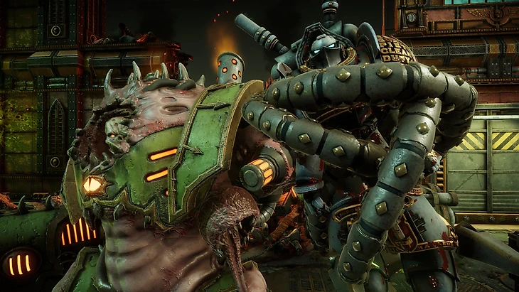 Кроме того, в сражении из превью показали дредноут Нургла – бронированный шагоход с ракетницами и огнеметом. Как и в настольном Warhammer, дредноут нельзя просто уничтожить, приходится поочередно выводить из строя механизмы: орудия, щиты и ноги. Но даже обездвиженный дредноут представляет угрозу для игрока.