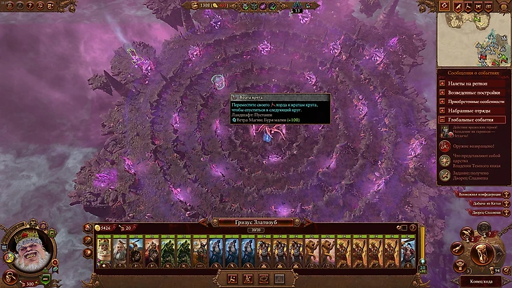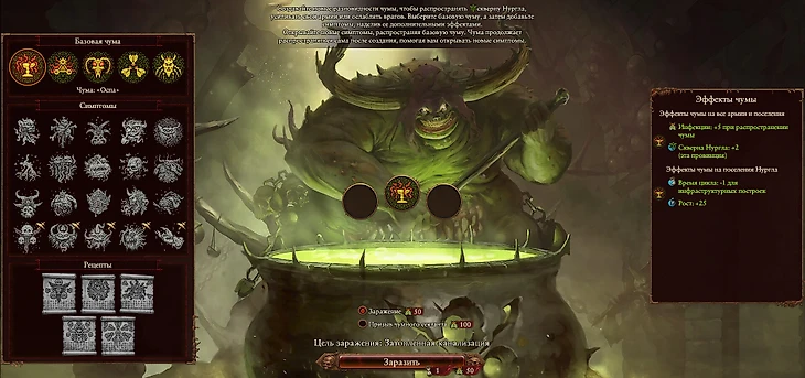 А что есть у мелких демонических фракций? Забавная механика циклических построек у культа Нургла. Постройки улучшаются и деградируют сами по себе: приходится ловить момент, когда можно купить того или иного юнита. Еще есть нургловский аналог Plague Inc. Чуму с разными эффектами можно распространять по своим и соседним регионам. Слаанешиты умеют соблазнять вражеские отряды человеческих и эльфийских фракций в бою и на глобальной карте. Армии Тзинча управляют магией и плетут заговоры, вредя соседям.