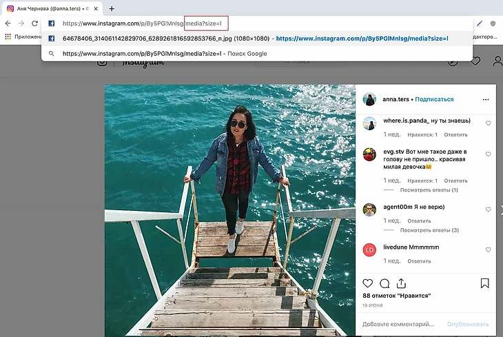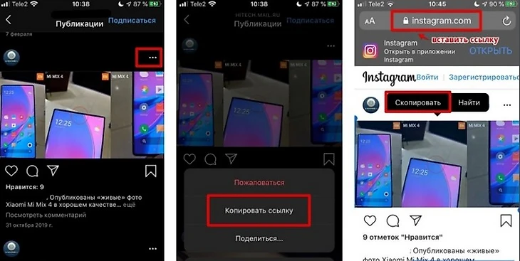 Для использования данного способа пользователь должен обладать смартфоном с операционной системой iOS. Суть же метода заключается в том, что вам необходимо скопировать URL фотографии (при использовании приложения необходимо нажать на кнопку с тремя точками и выбрать пункт “Копировать адрес ссылки”), а затем перенести эту ссылку в браузер Safari.