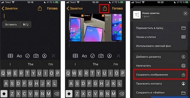 Перейдя по ссылке, нажмите пальцем на фотографию и держите до тех пор, пока не активируется функция выделения фото (при ее активации, фотография выделится синим цветом). Проведите пальцем вниз и перед вами откроется меню. В нем щелкните по пункту “Скопировать” и перейдите снова в приложение, в раздел “Заметки”.