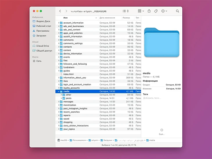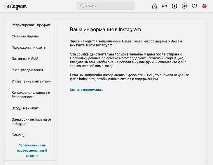Перейдите по полученной ссылке и активируйте вашу учетную запись. Перед вами откроется окно, в котором вы можете просматривать всю детальную информацию о вашем профиле: лайки, комментарии, переписки и многое другое. Но для вас важна папка media. В ней вы найдете все ваши фото и видеоматериалы и сможете легко скачать их на ваше устройство.