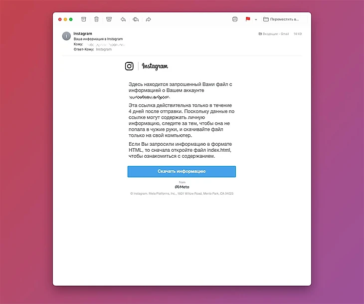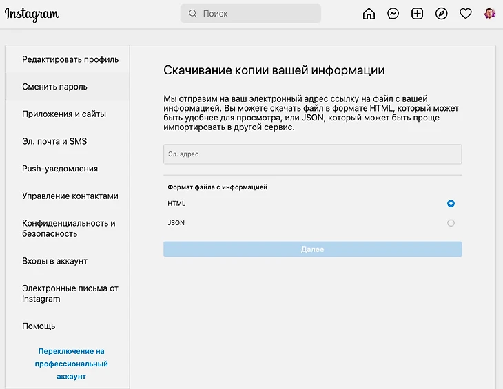 Авторизуйте вашу учетную запись в Инстаграм и перейдите с помощью любого браузера на специальную страницу для создания запроса на получение архива с вашими личными данными. Нажмите на кнопку “Далее” и подтвердите ваши действия внесением затребованного сервисом пароля от личного аккаунта.