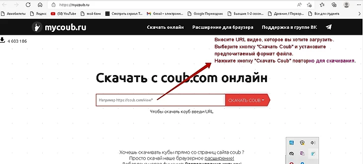 Вставьте URL в специальную строку посередине страницы сайта https://mycoub.ru, и выберите возле надписи: “Скачать Coub” желаемый формат видео (только музыка, только видео, музыка + видео, видео + музыка);