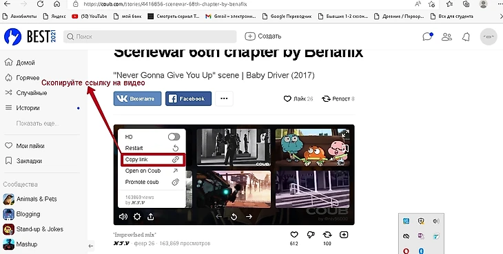 Перейдите на сайт Coub.com и откройте понравившееся видео. Нажмите на кнопку “Поделиться” и скопируйте ссылку на видеоролик, который вы хотите скачать;