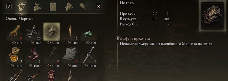Первый босс игры Маргит, которого можно встретить в замке Грозовой завесы, стал слишком серьезным препятствием для многих игроков. Но можно слегка считерить перед походом к нему – найти пасхального персонажа Лоскутика в Грязной пещере неподалеку от болота в стартовой локации, подраться с ним и сохранить ему жизнь, чтобы он стал продавцом. У него продается предмет «Оковы Маргита», который заставляет босса упасть на землю на пару секунд. Но вечно пользоваться ими не выйдет, они исчезнут после нескольких попыток, поэтому их лучше приберечь до второй фазы.