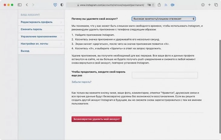 Чтобы удалить Instagram безвозвратно, вам необходимо лишь пару минут. Но знайте, что его восстановление будет невозможным. Даже служба поддержки здесь бессильна, ведь учетная запись стирается из всех серверов. Навсегда и безвозвратно.
