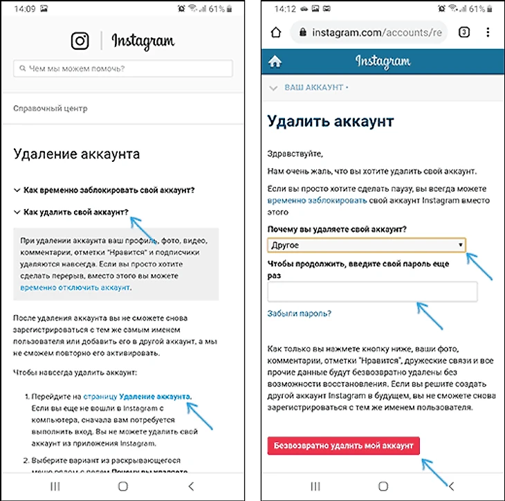 В открывшемся блоке выберите пункт “Как удалить свой аккаунт в Инстаграм”. Там же вы найдете сноску “Удалить аккаунт”, по которой нужно перейти.