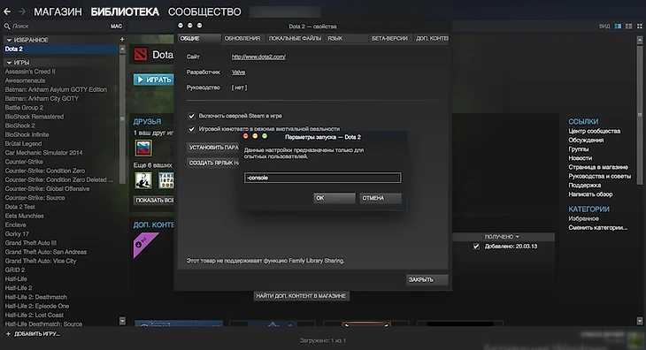 Для получения возможности вызова консоли в Dota 2, необходимо ввести в Steam параметра запуска «-console».