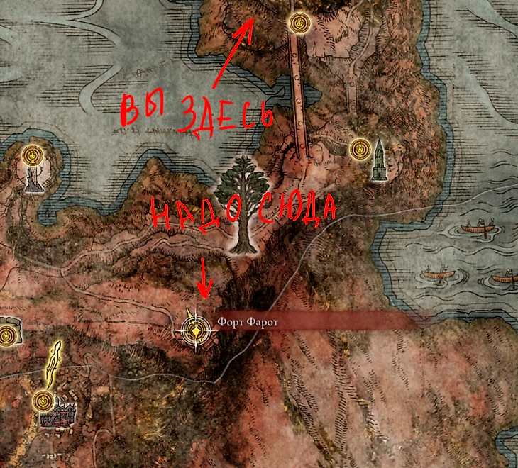 Если у вас не открыта карта Звездных пустошей, воспользуйтесь картой на скриншоте ниже. Кстати, если доехать до древа Эрд, то можно запрыгнуть наверх с помощью священного источника. Так или иначе, дорога приведет вас к форту Фаро, рядом с которым лежит бледный умирающий дракон. Точку благодати у форта нужно обязательно активировать до начала фарма.