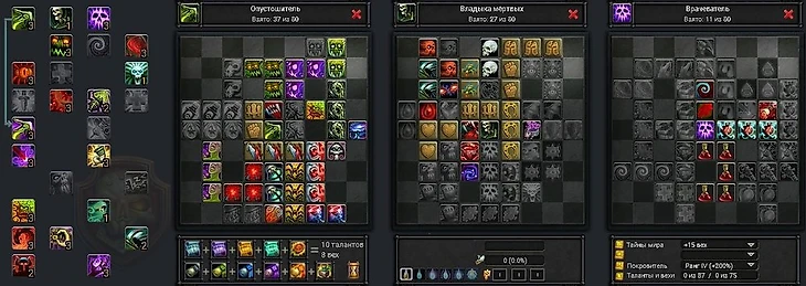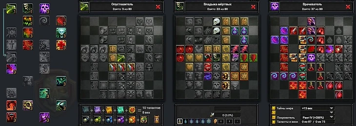 Начинаем схватку с ДХ и ИЖ, чтобы подкопить стаки Могильного Холода и Мрачного Жнеца. Кидаем Лужу (Кровопускание) и Ритуал Чумы (АОЕ) или же Ритуал Боли (соло), а после продолжаем вкачивать в ДХ и ИЖ. Не забываем использовать ритуалы по кд.
