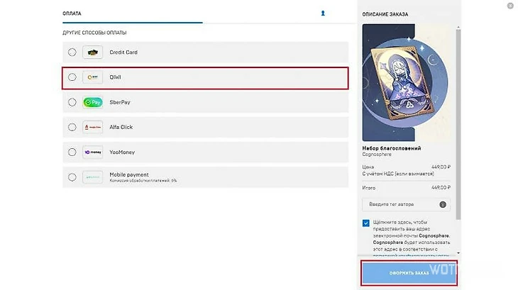 Выберите купить игру Геншин через лаунчер Epic Games Store. Оплатить можно с помощью QIWI. Можно купить Боевой пропуск.