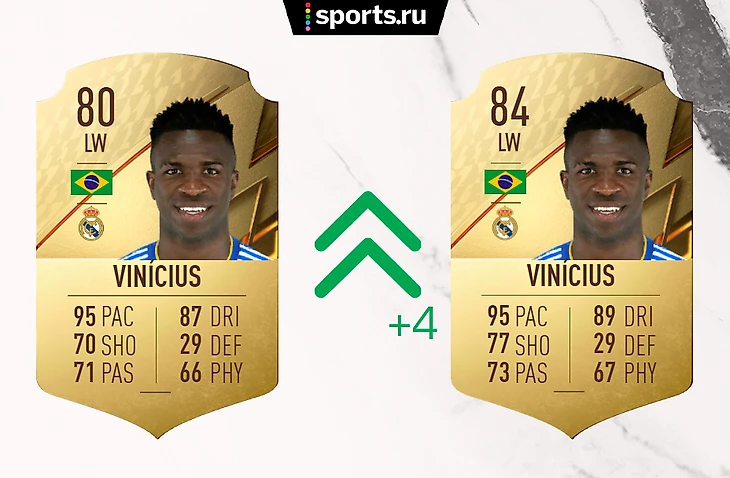 В первые годы карьеры в Мадриде Винисиус отличался высокой скоростью, но не мог похвастаться хорошим завершением. В этом сезоне бразилец сильно прибавил: перестал мазать по воротам и уже сделал 14+9 в Ла Лиге. В FIFA 23 его карточка будет очень крутой! Не сомневаемся, что вскоре талантливый бразилец попадет на обложку FIFA.