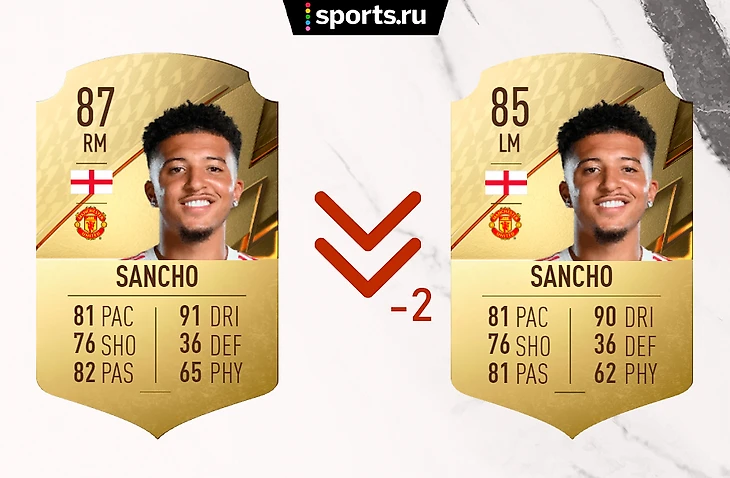 Джейдон Санчо с рекордной скоростью набивал голевые очки в Бундеслиге и перешел в «МЮ» звездой. На родине вингер столкнулся с большими трудностями: долго не мог сыграться с партнерами и выглядел медлительным. «Ман Юнайтед» верит в англичанина, но в симуляторе EA его уже подрезали до 85.