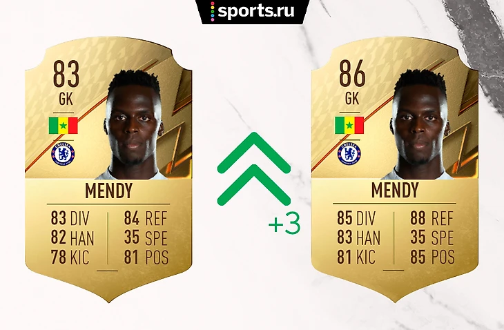 Еще осенью мы писали, что лучший вратарь 2021-го Эдуар Менди получил неадекватно низкий рейтинг. Сенегалец не прибавил, но EA наконец-то признала его высокий уровень. 2 пункта до провалившего ЛЧ Доннаруммы все еще выглядят странно – осенью канадцам стоит задуматься над финальным рейтингом Эдуара.
