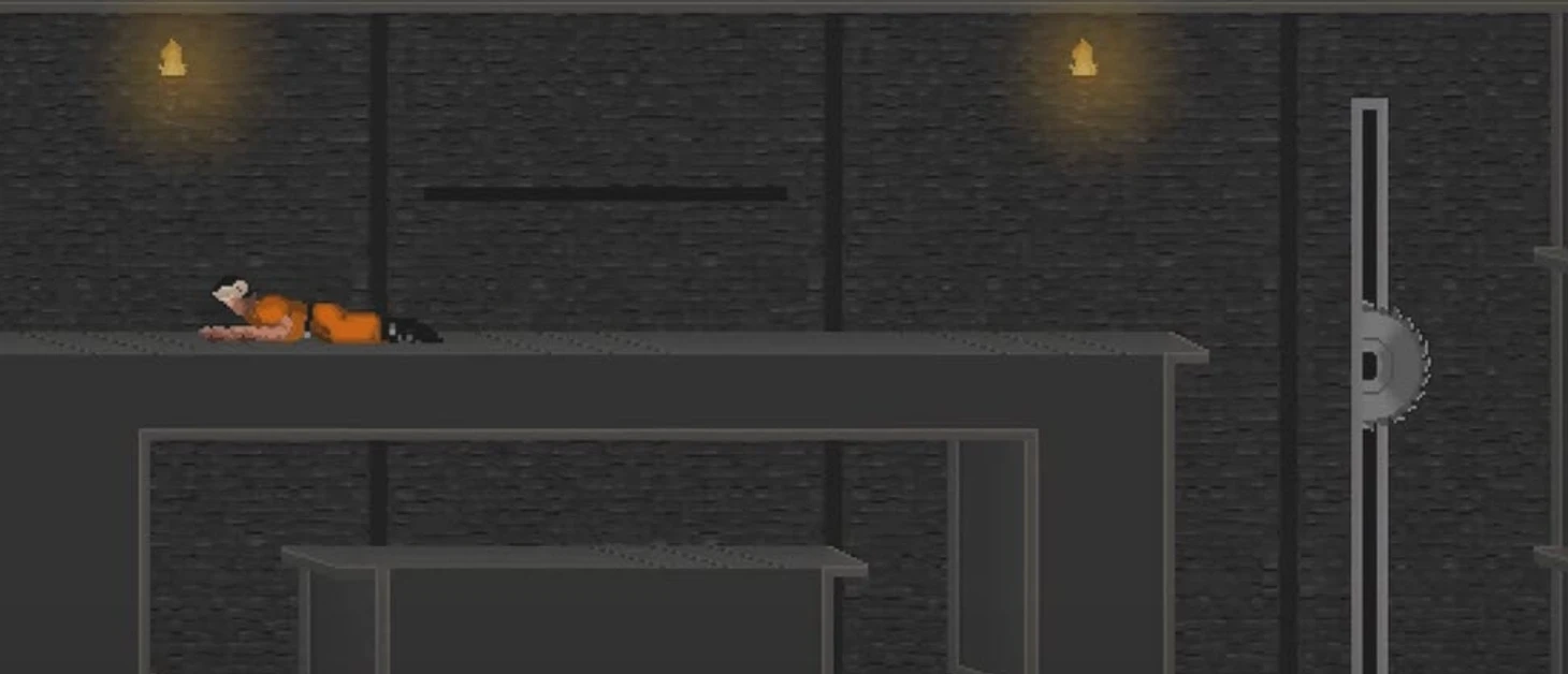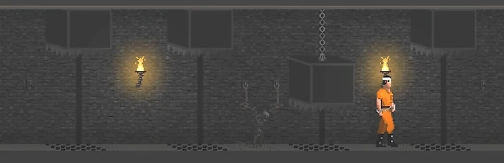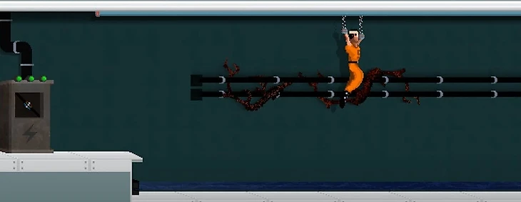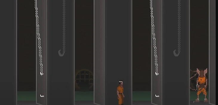 Выходим к месту расположения камер с заключенными. Здесь расположен рычаг, аналогичный предыдущему, дернув за него произойдет поднятие решетки, но только на определенное время, после которого она опустится обратно. Игроку необходимо как можно быстрее бегать к решетке до момента ее опускания, после чего нагнуться и пролезть под ней.