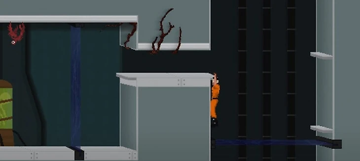 Далее вы оказываетесь в лаборатории и сталкиваетесь с новой преградой: жуками прилипалами. Спрятаться от них можно воспользовавшись свободным пространством в стене.