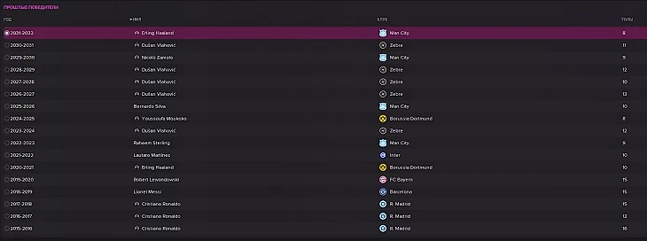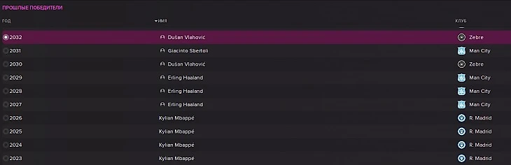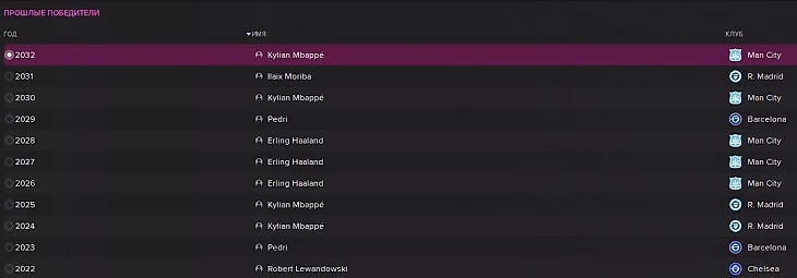 В первом сэйве Холанд получит «ЗМ» еще при живых Роналду и Месси – в 2023-м: неудивительно, учитывая победу в ЛЧ и звания лучшего бомбардира в ЛЧ и АПЛ. Правда, здесь стоит уточнить, что Football Manager особо не учитывает трофеи – при присуждении награды он смотрит на среднюю оценку и репутацию игрока.
