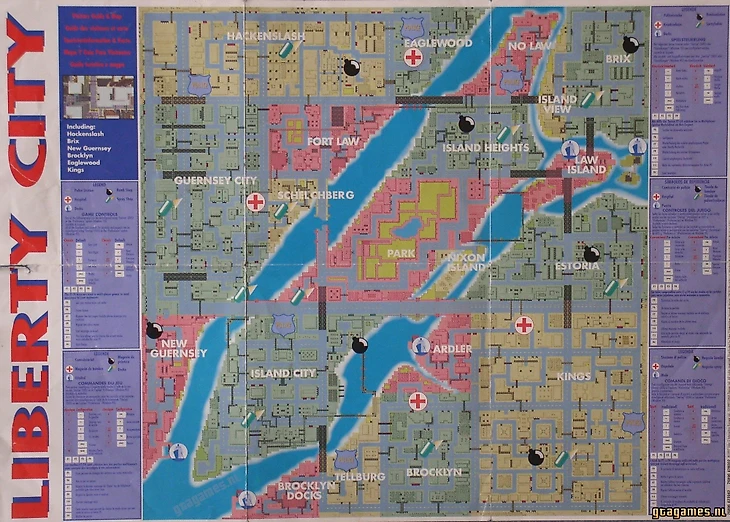 Городов в GTA было три: не поверите, Либерти-Сити, Вайс-Сити и Сан-Андреас. Они уже тогда были узнаваемы, например, река разделяла Либерти-Сити на три района, а в центре среднего находился парк. Сан-Андреас был вдохновлен Сан-Франциско – и в нем множество подъемов, спусков и трамвайных путей. Ну а в Вайс-Сити куча пляжей и роскошных вилл. Уже тогда студия заморочилась и сделала городам разный автопарк, включая служебный и общественный транспорт.