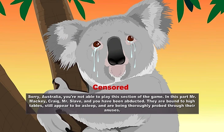 Hо самая забавная цензура случилась с South Park – The Stick of Truth. Специально для Австралии была выпущена версия, где на месте всех особо «опасных» сцен висело вот такое изображение-заглушка с плачущей коалой и текстовым описанием того, что должны были получать игроки, играй они из любой другой страны.