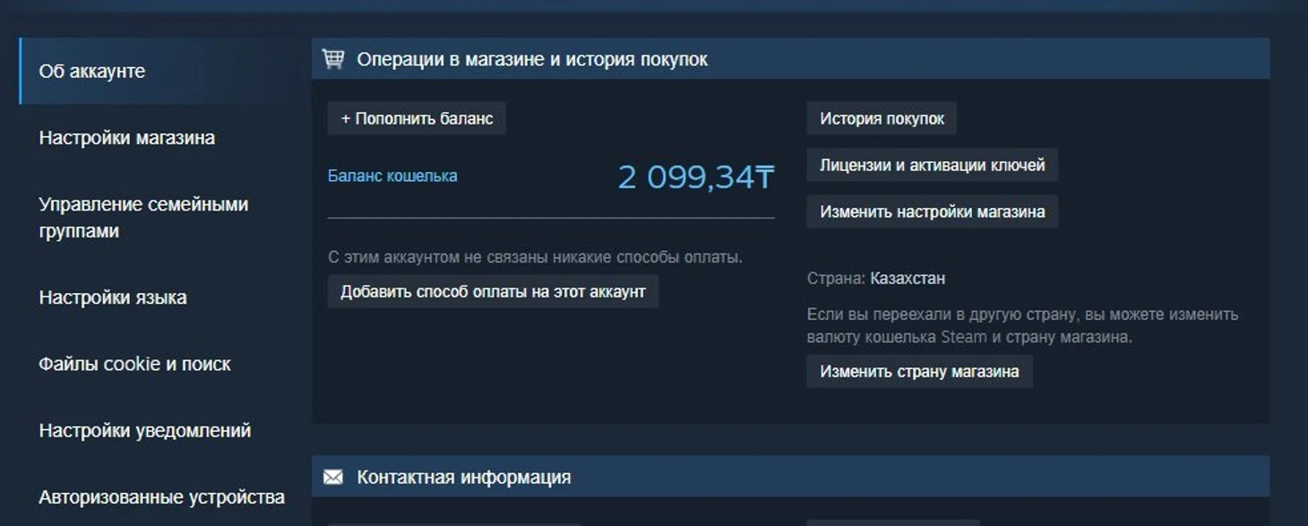 Воспользуйтесь надежным сервисом пополнения Steam для другого региона. Например, хорошо подойдет МТС Оплата для казахстанского аккаунта Steam. Отправьте небольшую сумму. Информация в настройках «Об аккаунте» поменяется: баланс кошелька зафиксирует новую валюту и страну (в данном примере тенге и Казахстан), а недоступные игры появятся в магазине