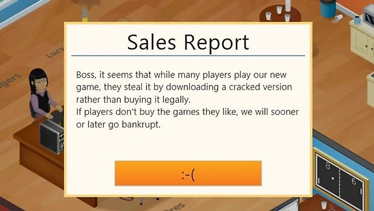 Разработчики Greenheart Games сами выложили на торренты пиратскую версию почти сразу после релиза. Но в ней было одно значительное отличие – как только игрок достигал успеха со своей студией, игра начинала подкидывать ему высокий уровень пиратства, который приводил к банкротству. Таким образом студия безо всяких нравоучений давала пиратам понять, что они делали не так.