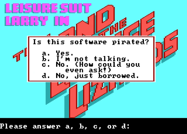 Серия приключенческих квестовых игр про Грязного Ларри начала выходить еще в 1987 году. Тогда не существовало никаких DRM-систем, защищающих игры от пиратства. Разработчики придумали несколько способов по борьбе с пиратством. Например, в игре напрямую спрашивают, спирачена ли игра. Можно ответить честно, и она закроется. Правильный ответ, кстати, третий. Эта же таблица с вопросами выводилась для проверки возраста: игроков спрашивали, что такое VCR (видеомагнитофон), как зовут четвертого члена группы The Beatles, и каким по счету президентом США был Никсон (37-м).