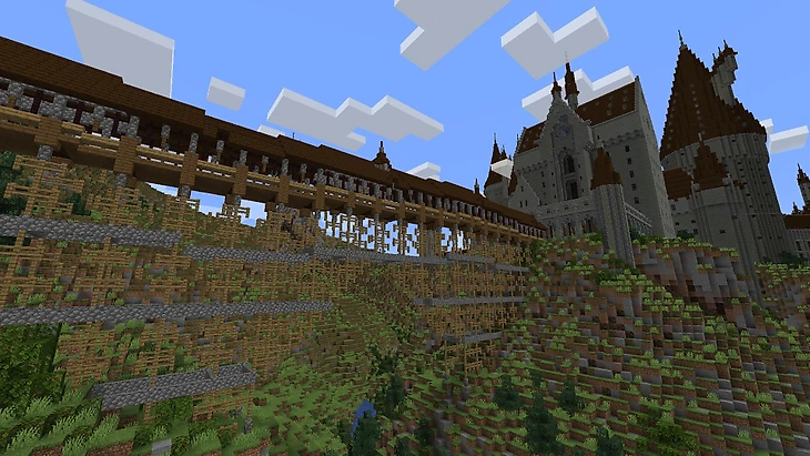Killerfranz345 построил Хогвартс в классическом стиле. Школа магии состоит из массивных зданий, которые слабо проработаны внутри, однако впечатляют снаружи. Замок получился схематичным, но точным в деталях. Необычная реализация дома Хагрида стала дополнительным украшением крепости.