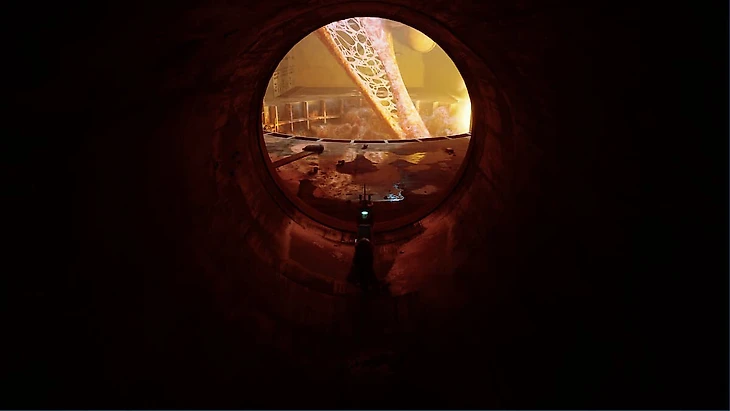 Для открытия первого воспоминания посмотрите в направлении, куда смотрит Страж (робот в красной одежде с посохом), и идите к красному автомату слева. Заберитесь на него и продолжайте двигаться наверх. На крыше поверните налево и продолжайте прыгать, пока не доберетесь до металлической крыши. Там вы найдете мертвого робота, прислонившегося к металлической вывеске – это ваше первое воспоминание.