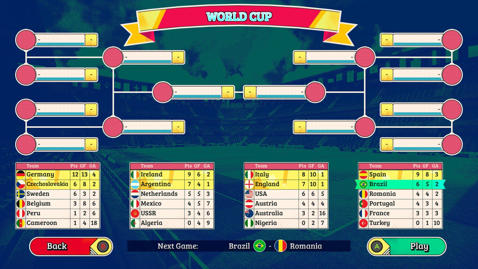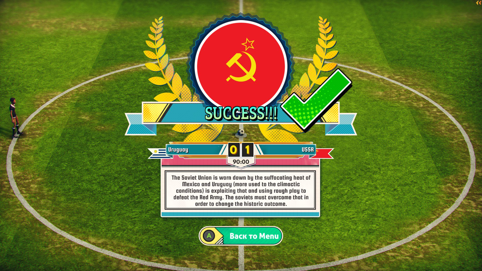 Играть тяжело. Начинал я на среднем уровне, но после слива Бразилией СССР понял, что лучше сперва научиться грамотному перепасу и дриблингу в нужный тайминг. ИИ часто отбирает мяч даже на новичке и умудряется как-то забивать, хотя в целом сложность фартовая. А Суперудар нужно еще активировать, когда рядом нет защитников, иначе он просто сгорит без всякой пользы! Обычных ударов это тоже касается: слабые и средние удары вратарь тащит со 100% успехом, а чтобы нанести сильный удар опять же требуется решить головоломку, чтобы рядом никого не оказалось. Воистину необычный геймплей!