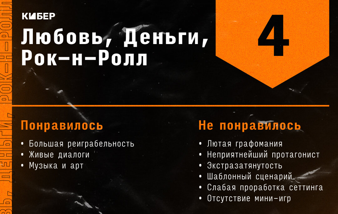 «Любовь, Деньги, Рок-н-Ролл» пошла по пути «Бесконечного лета», вот только ударилась в графоманию и беззубую детективную историю. Новелла настолько затянута, что читать ее всерьез – неслабый удар по психике. Но она классно выглядит и звучит, возможно, вам захочется пройти еще один рут и вновь окунуться в романтические перипетии старшей школы.