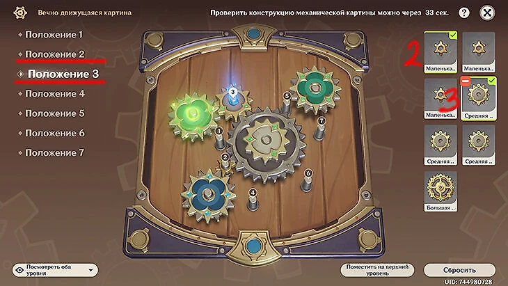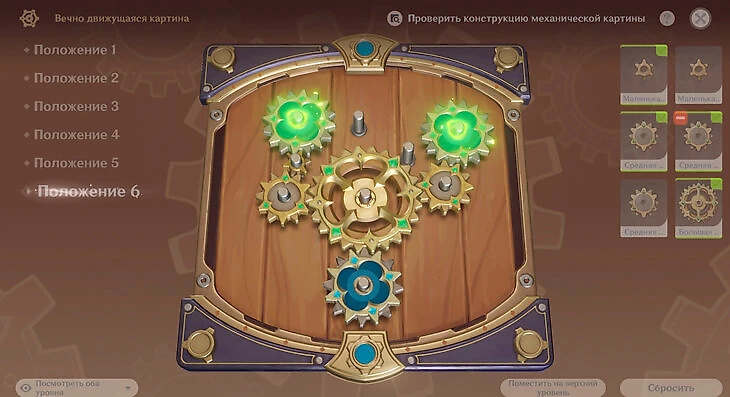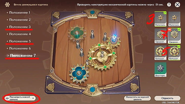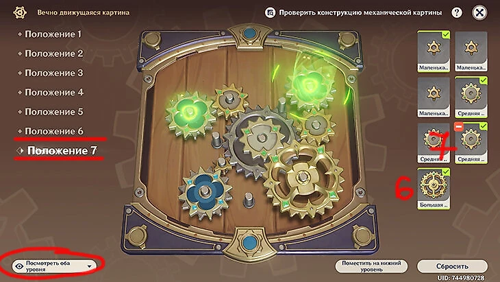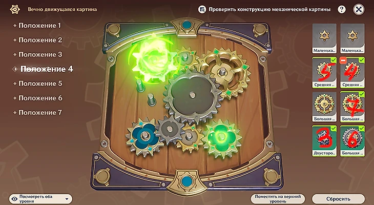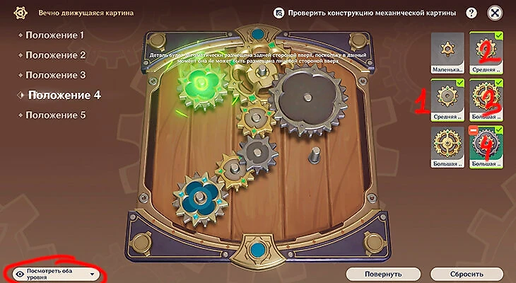 В положение 6 нужно установить двустороннюю деталь. Если она не начнет крутиться, сбросьте положение кнопкой справа снизу и перейдите на другой уровень высоты. На верхнем уровне надо установить среднюю шестеренку в положение 4.