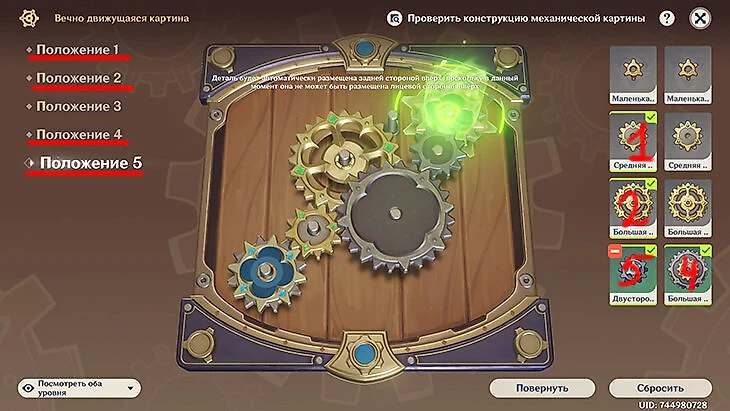 Положения 3 и 5 можно оставлять нетронутыми. В награду за решение головоломки вы получите 60 камней истока, 30 000 моры и 3 цепи львиного клыка.