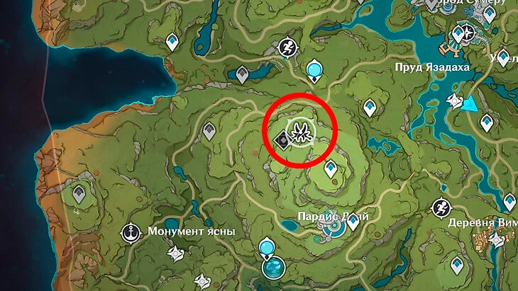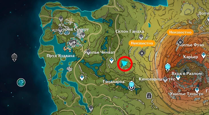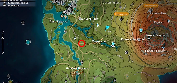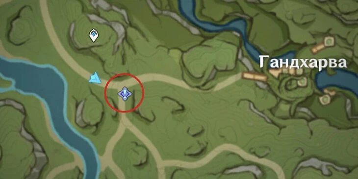 Далее по заданию нужно отыскать мастера сказок Танжера в Гандхарве. Нужно подойти к указанному на карте месту. Удобнее всего это сделать с заранее открытой статуи Архонта.