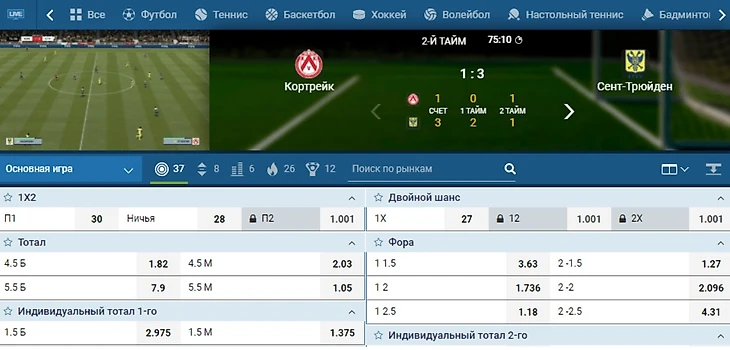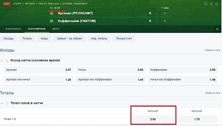 Выбрав матч, начинайте следить за ним. Если за первые 25-30 минут соперники забили 3 гола, это гарантирует результативный поединок и в дальнейшем (в 90% случаев). Одна команда побежит отыгрываться, вторая – добивать и увеличивать разрыв в счете. Следует ставить на ТБ 5,5 – коэффициент на этот рынок в середине первого тайма составляет около 2.0.