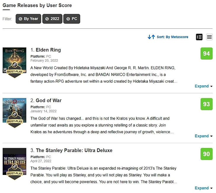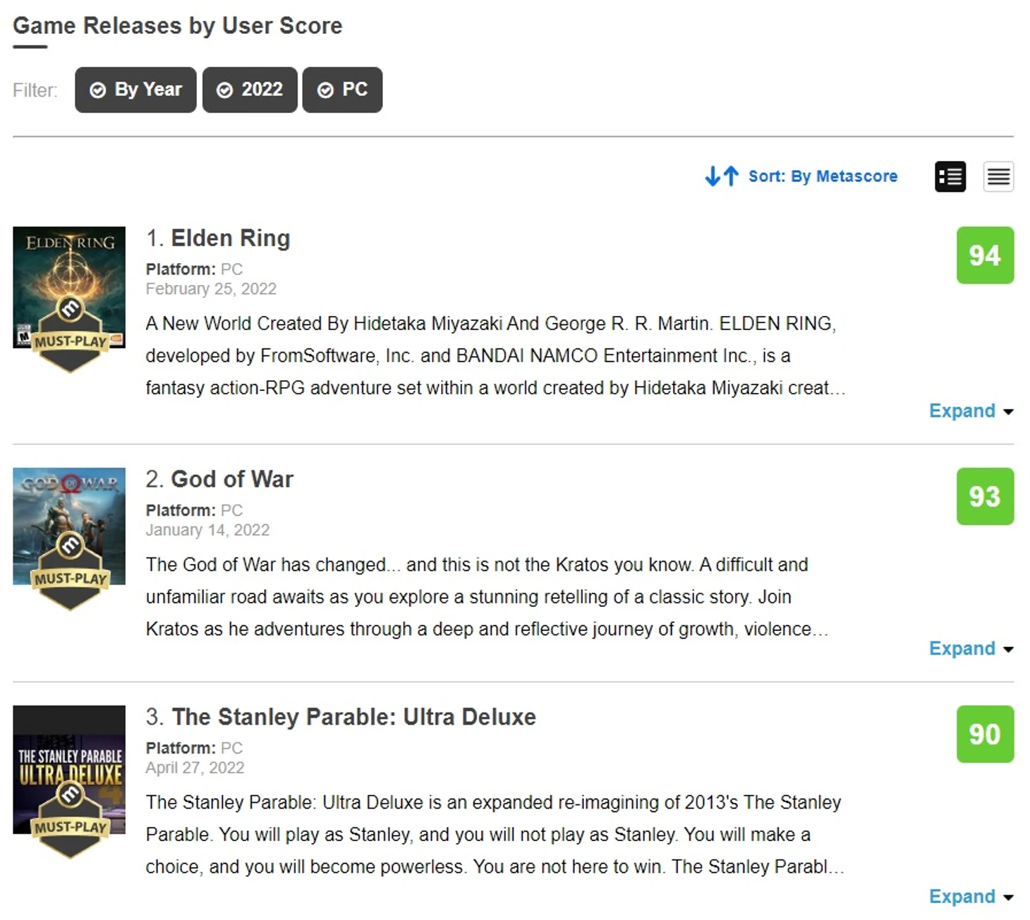 Можно пойти дальше и посмотреть готовые подборки по годам и интересующим платформам. В 2022-м лидирует Elden Ring.